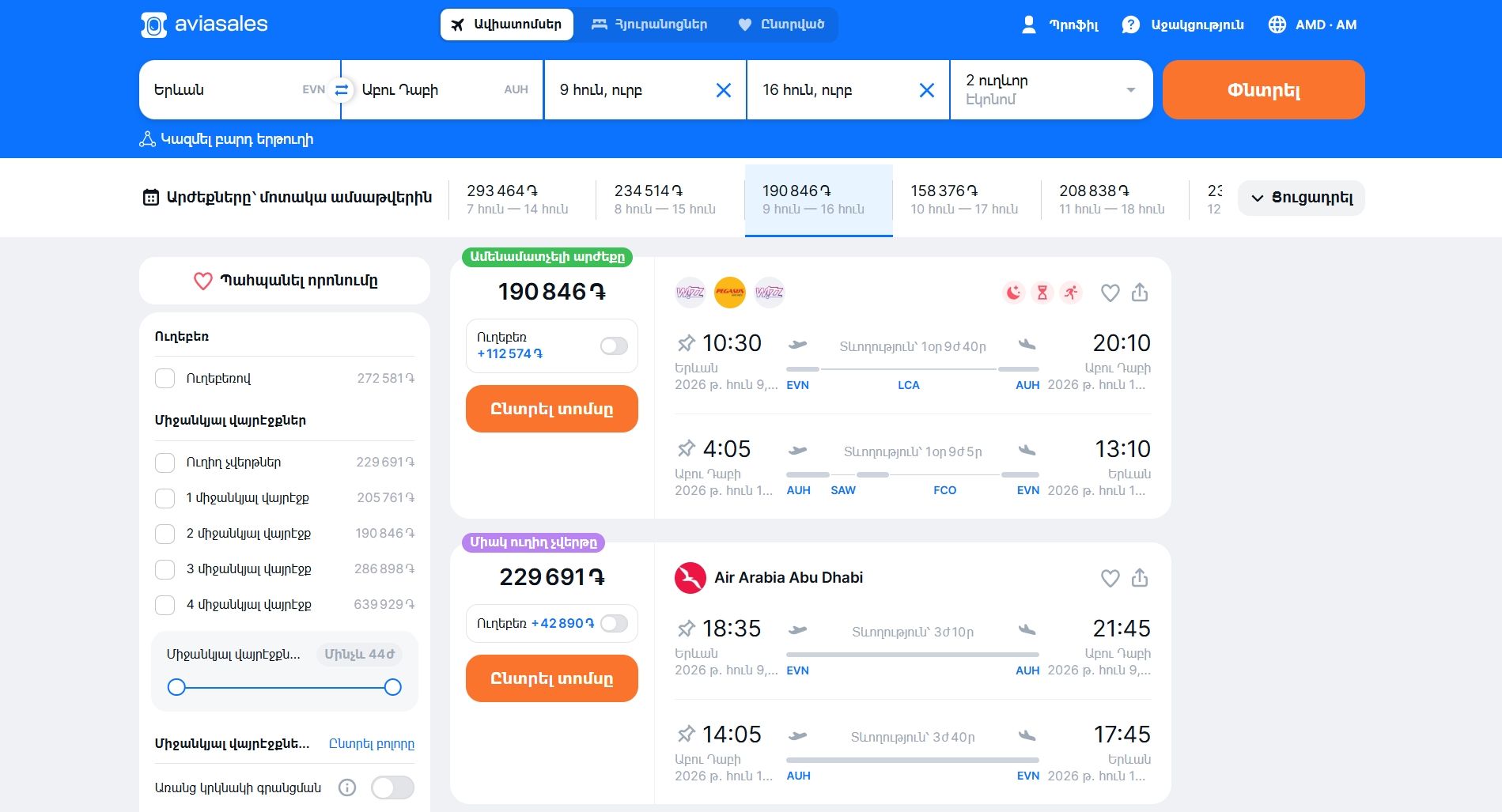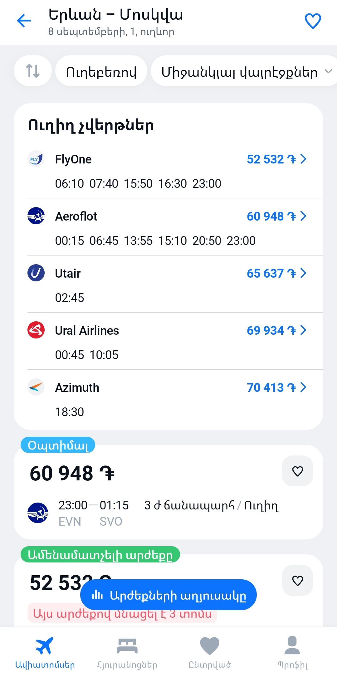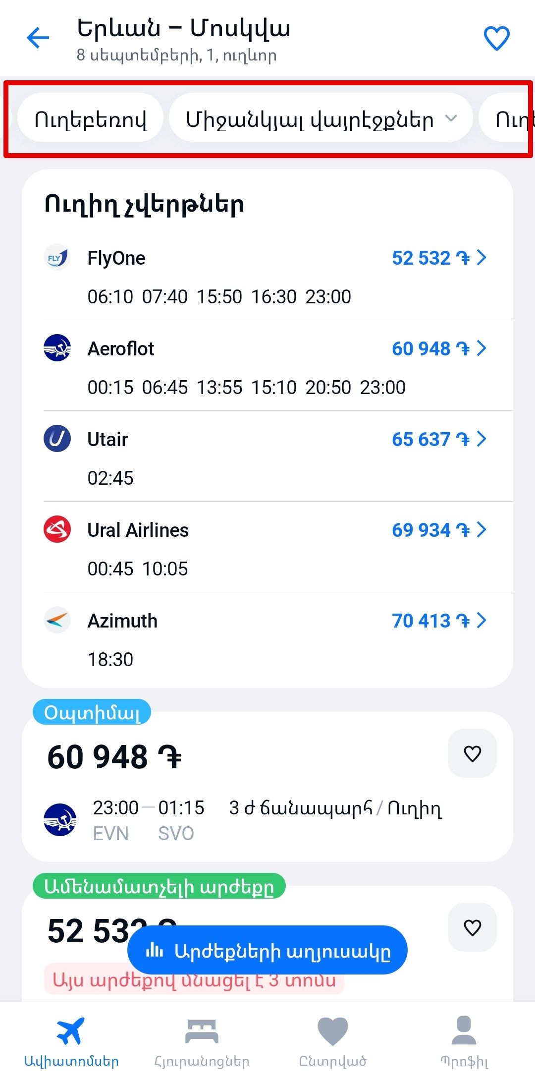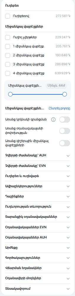 Կայքում և հավելվածում առկայության դեպքում կցուցադրենք ուղիղ չվերթներ և թռիչքների այլ տարբերակներ։ Դուք կարող եք համեմատել և ընտրել ամենամատչելին, արագը և հարմարը։