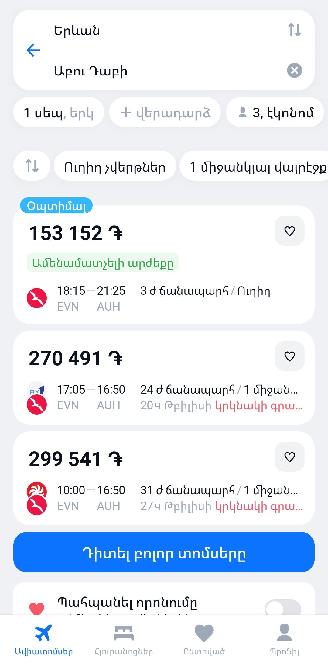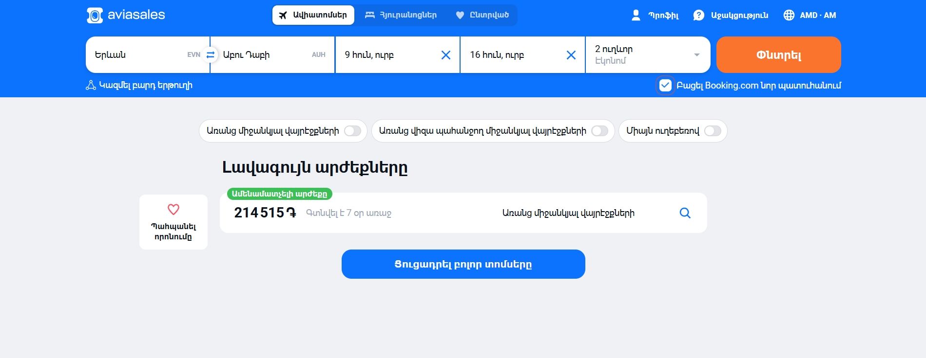 Սեղմեք «Գտնել տոմսեր» և սպասեք որոնման ավարտին, որպեսզի տեսնեք բոլոր հասանելի չվերթները։