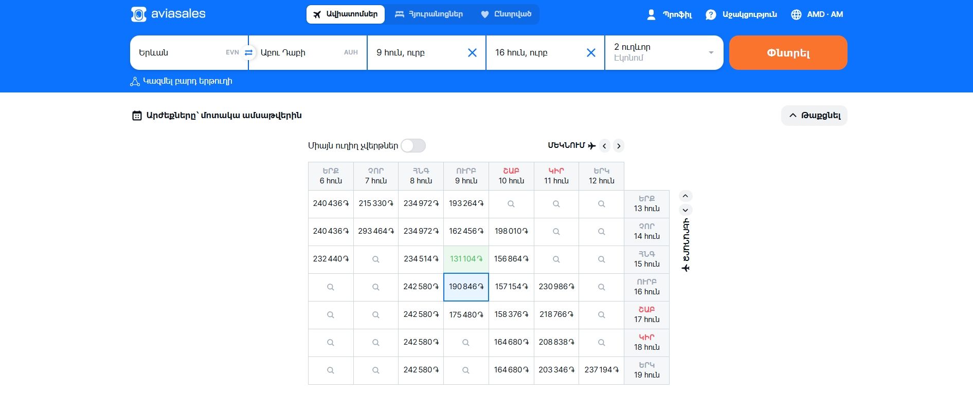 - Օրացույցում ամենամատչելի տոմսերով ամսաթվերը նշված են կանաչ գույնով։