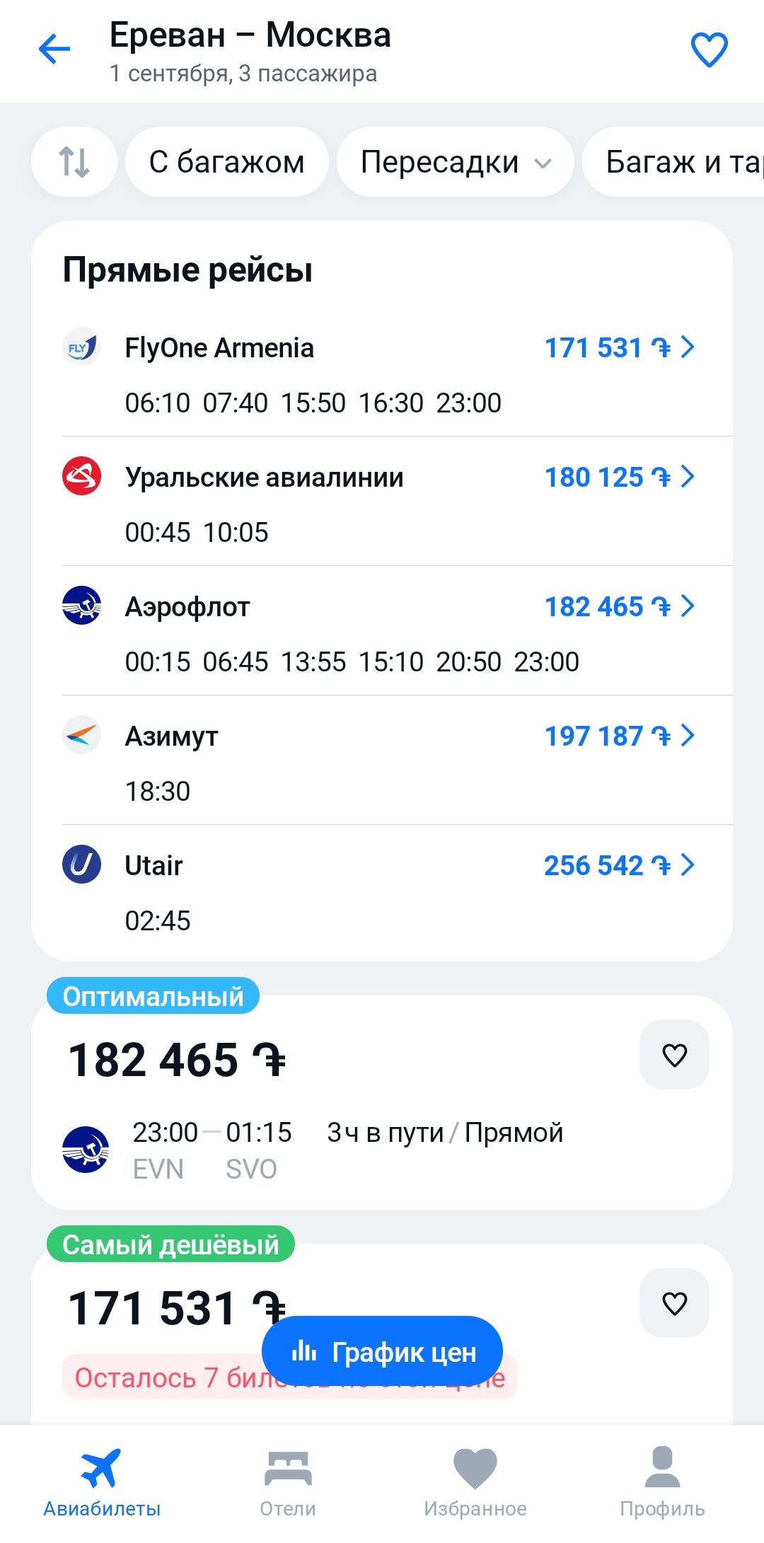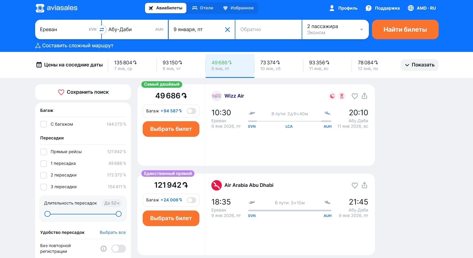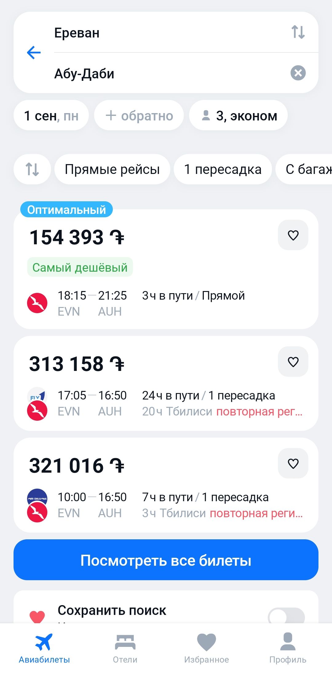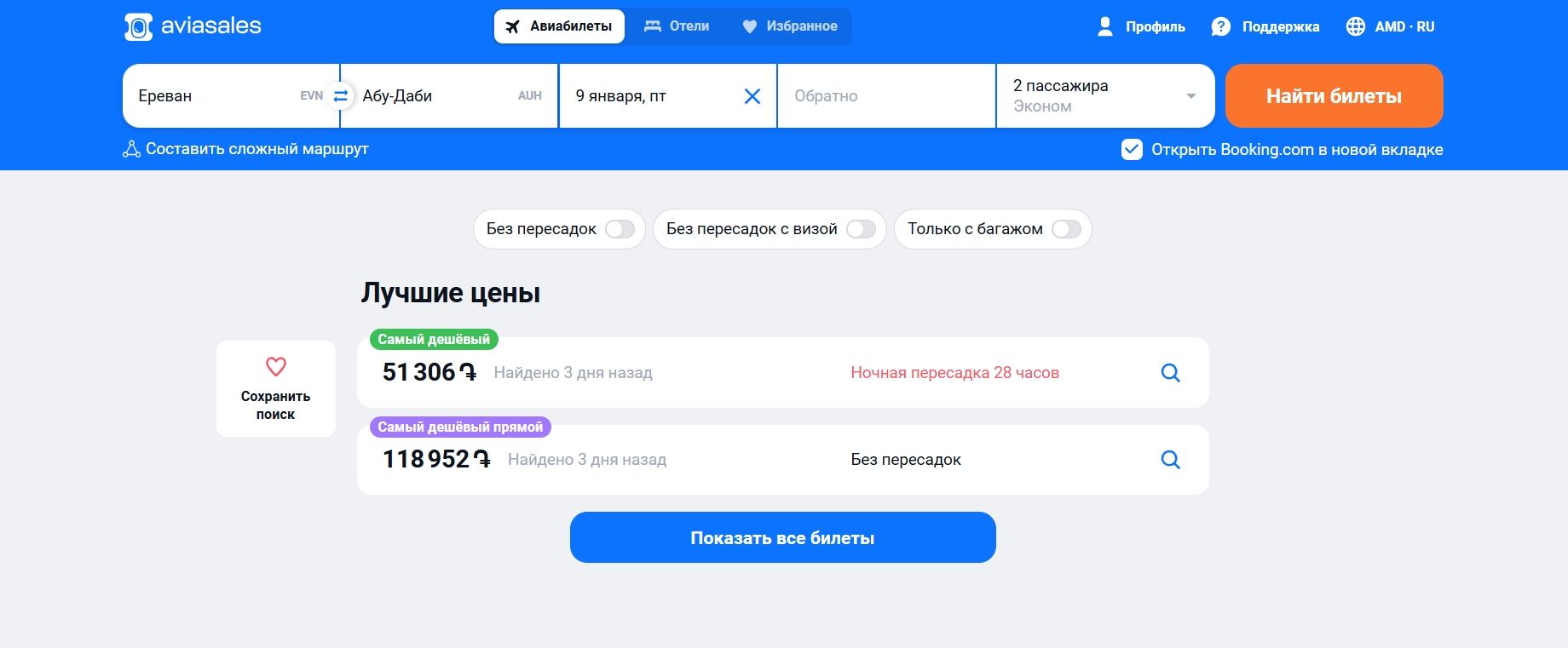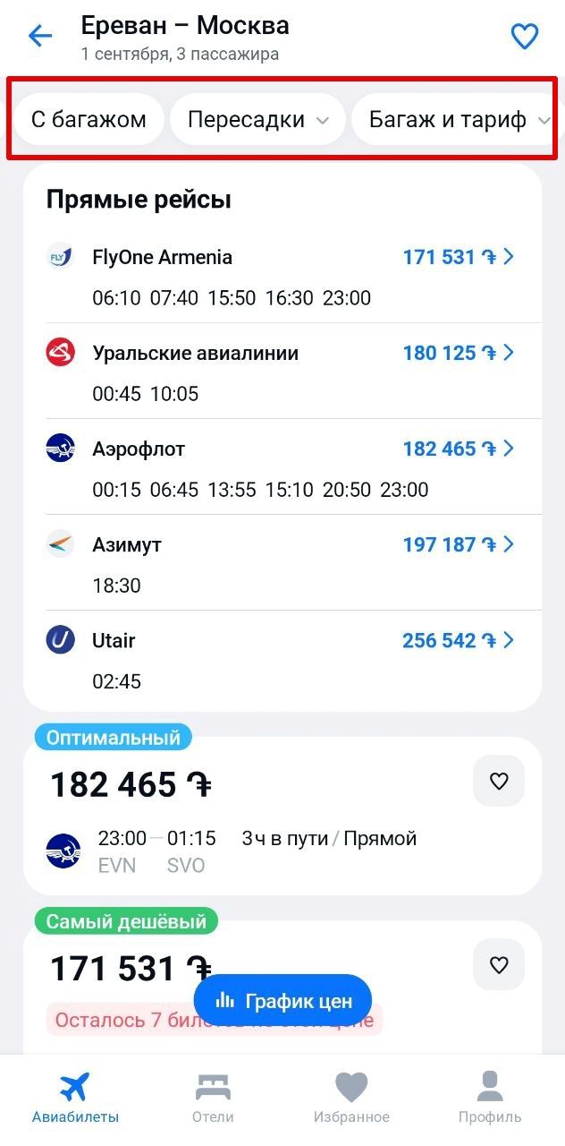 - бейджи: прямые, самые дешёвые или самые удобные рейсы.