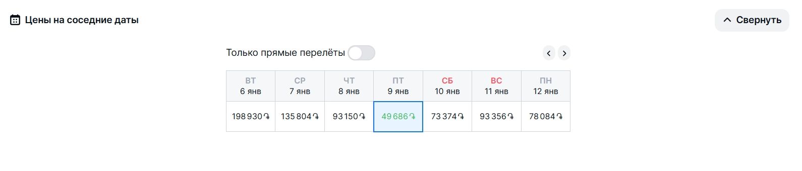 Используйте график, чтобы сравнить цены на соседние даты, или таблицу — для соседних месяцев. В них мы показываем минимальные цены по вашему направлению, найденные другими пользователями за последнюю неделю. Чем популярнее направление, тем больше цен будет в графике и таблице.